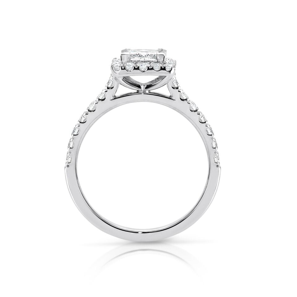 GIA certified princess 0.70 ct F/SI2 set in 18K W/G halo ring. TCW 1.20+ cts